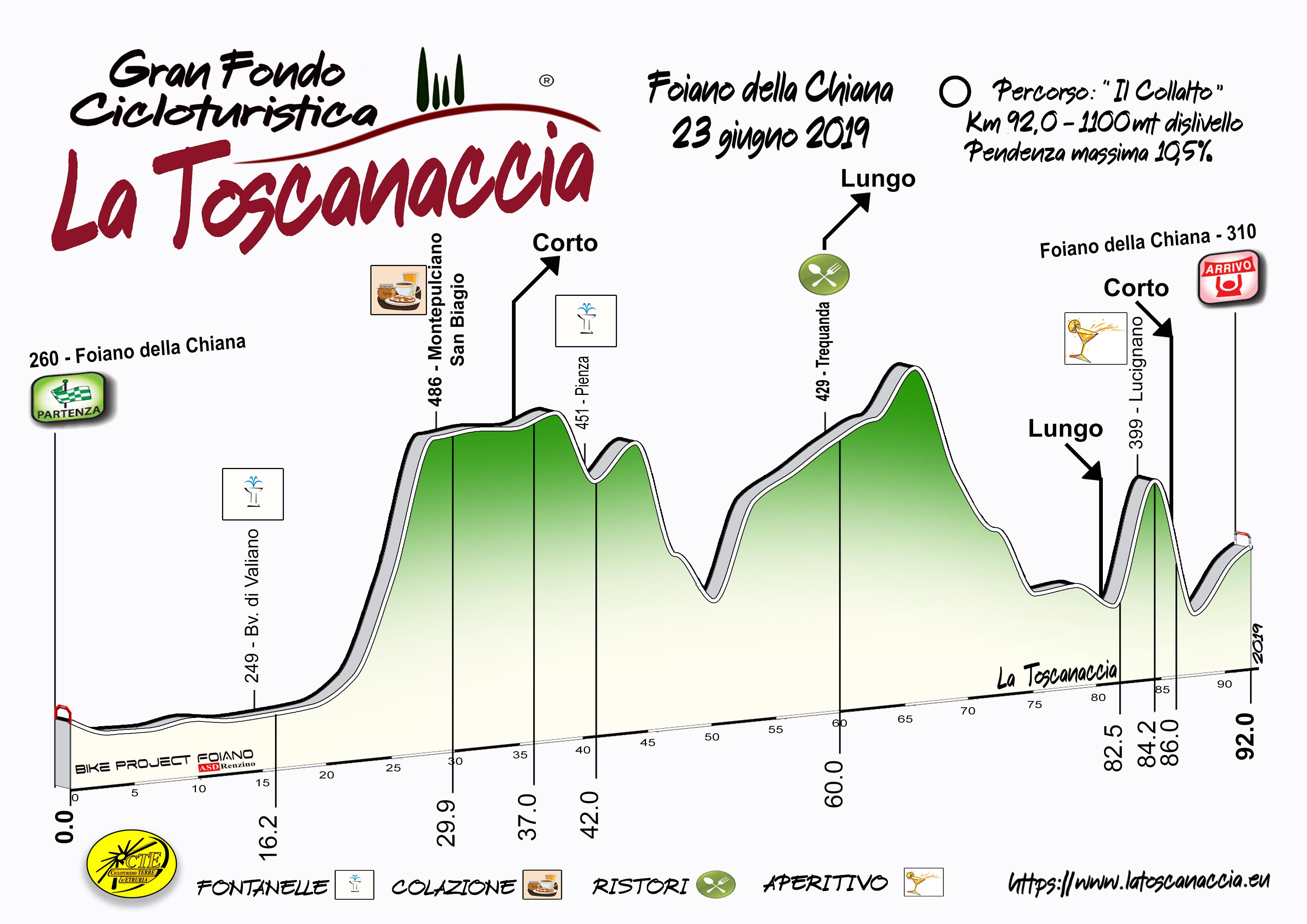 Poi arriva il “Collalto”, 92 km., che ci porta da Montepulciano a Pienza, splendido centro della Val d’Orcia, indicata nel rinascimento come città ideale, e riconosciuta dall’UNESCO patrimonio mondiale dell’umanità.